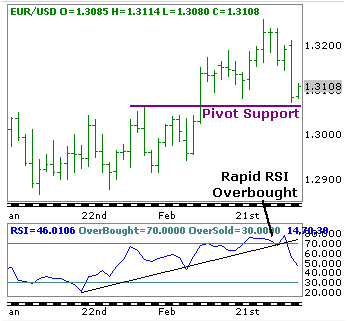 This second image is the 2-hour chart of EURUSD but here it can be seen that the peak at 1.3258 was accompanied by a bearish divergence in Rapid RSI. We are therefore on warning that a reversal can occur and that the daily overbought reading may well be correct.